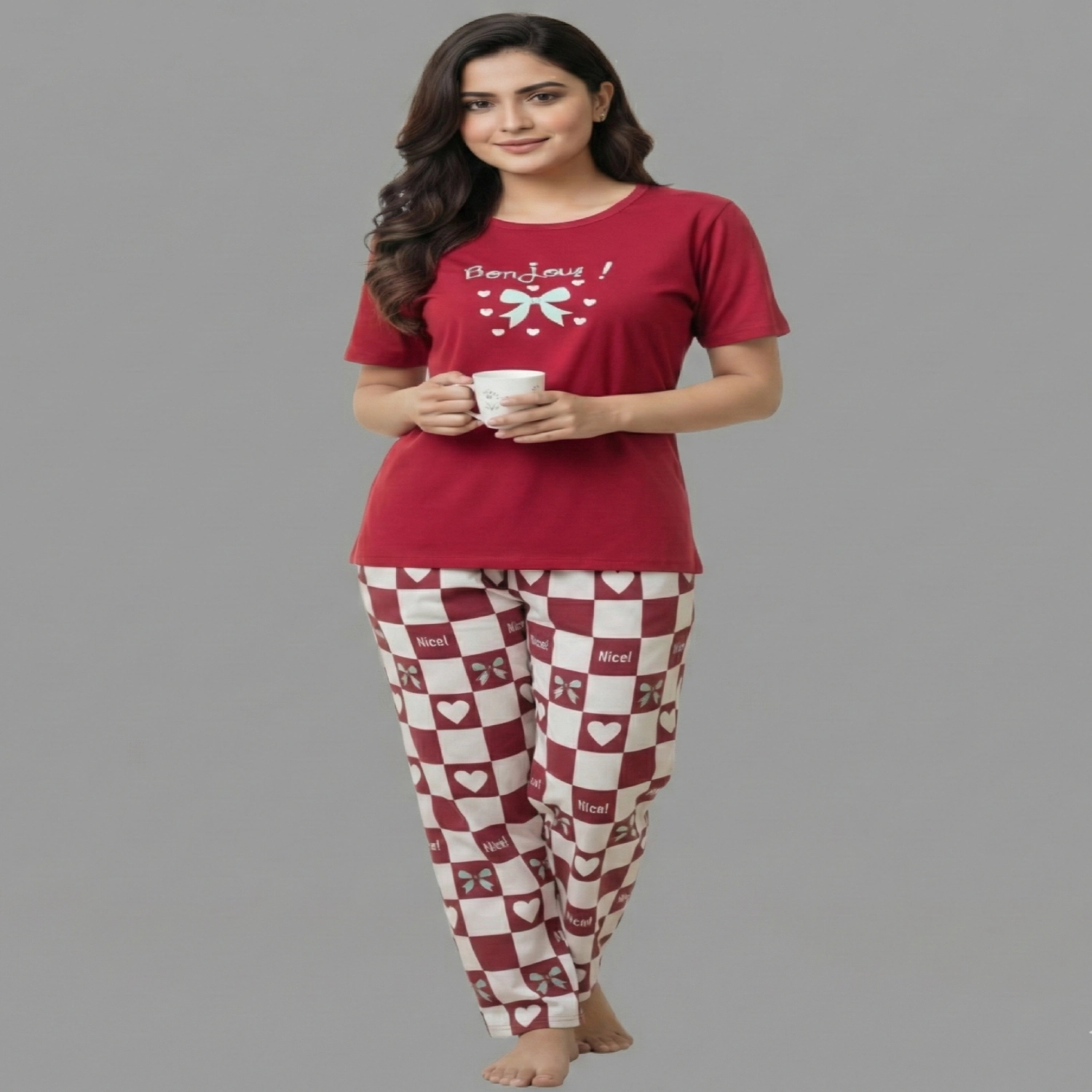 • Women Cotton Jersey Night Suit (Burgundy)