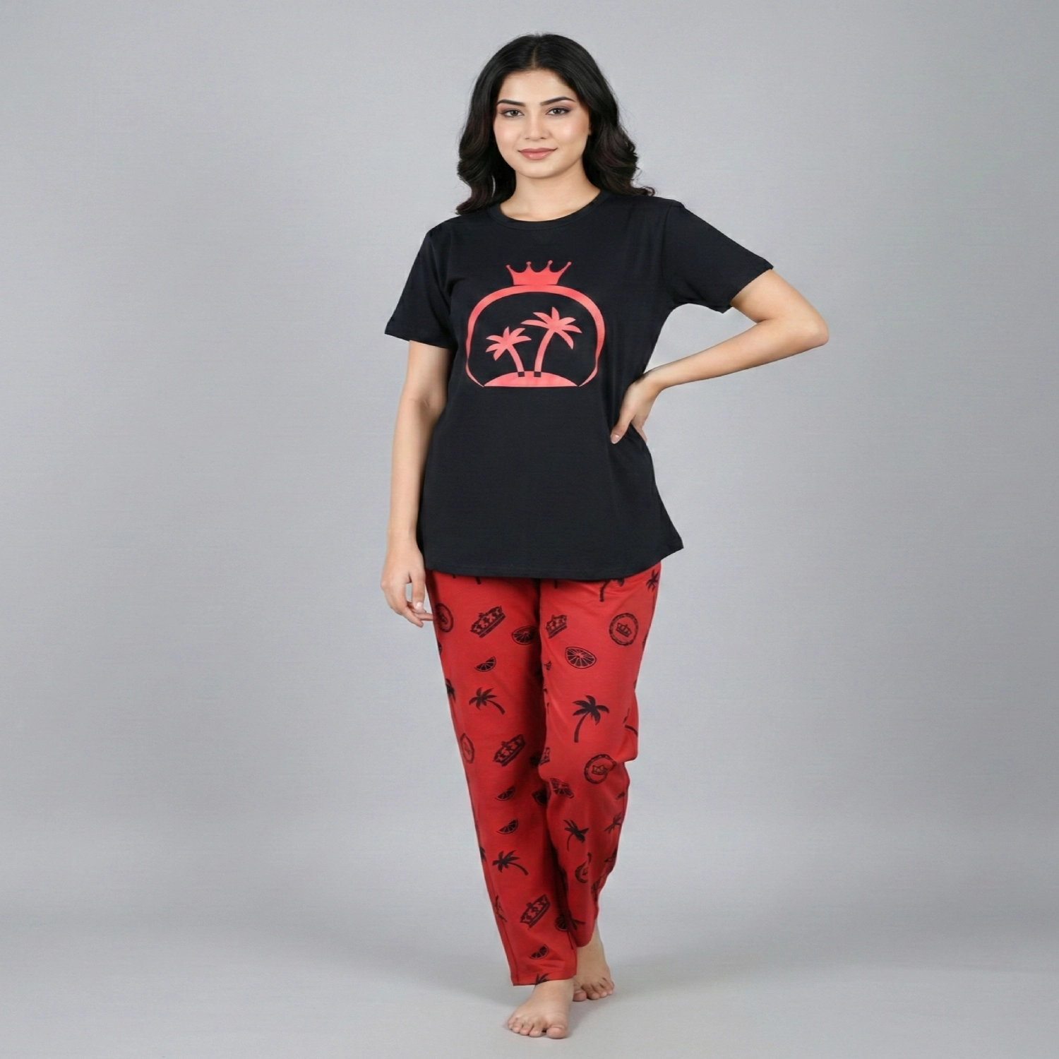 • Women Cotton Jersey Night Suit (Black Red)