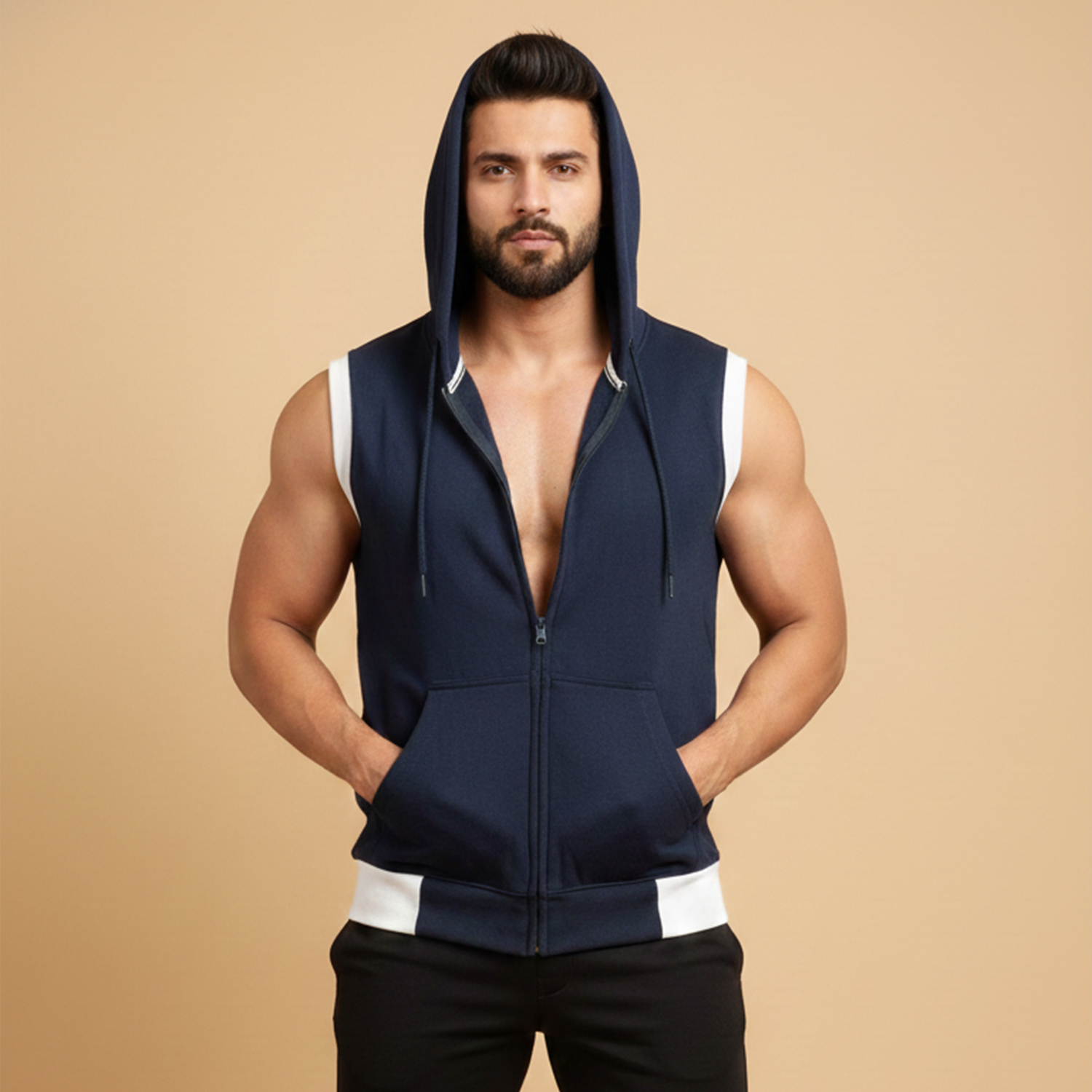 A mens sleeveless hoodie designed for performance and style. Made from soft, breathable fabric, it offers unrestricted movement and all-day comfort. Perfect for workouts, training sessions, or casual wear, this hoodie delivers a bold athletic look with a modern edge.